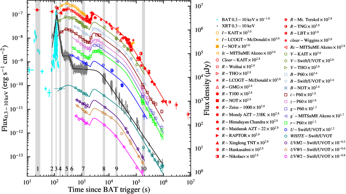 Multiwavelength light curves of GRB 151027A. The gray shaded regions indicate the time intervals used for spectral analysis. The solid curves show best-fit empirical functions to the temporal evolution.