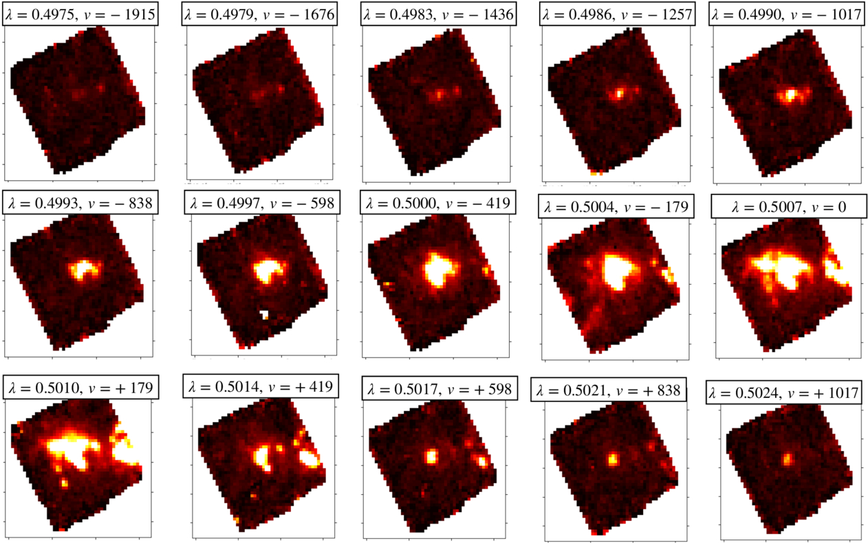 Velocity-resolved [O III]λ5007 channel maps in TN J0121+1320 illustrate the kinematic evolution of the ionized gas across the emission-line profile. In the most blueshifted slices (λ < 0.5000 μm), the emission is concentrated in two compact knots separated by ∼1″ (∼7.5 kpc). These features likely trace high-velocity, blueshifted gas near the AGN. As the slices approach the systemic wavelength, [O III] emission exhibits an extended, asymmetric structure, bridging the two knots and revealing they are part of a coherent ionized structure coincident with the radio AGN location. When the slices go progressively redder, a third emission component ∼2″ east of the radio AGN core becomes prominent at these velocities. This feature, which was completely absent in the blue wings, may reflect lower velocity gas or a distinct companion system as suggested by W. Wang et al. (2025a).