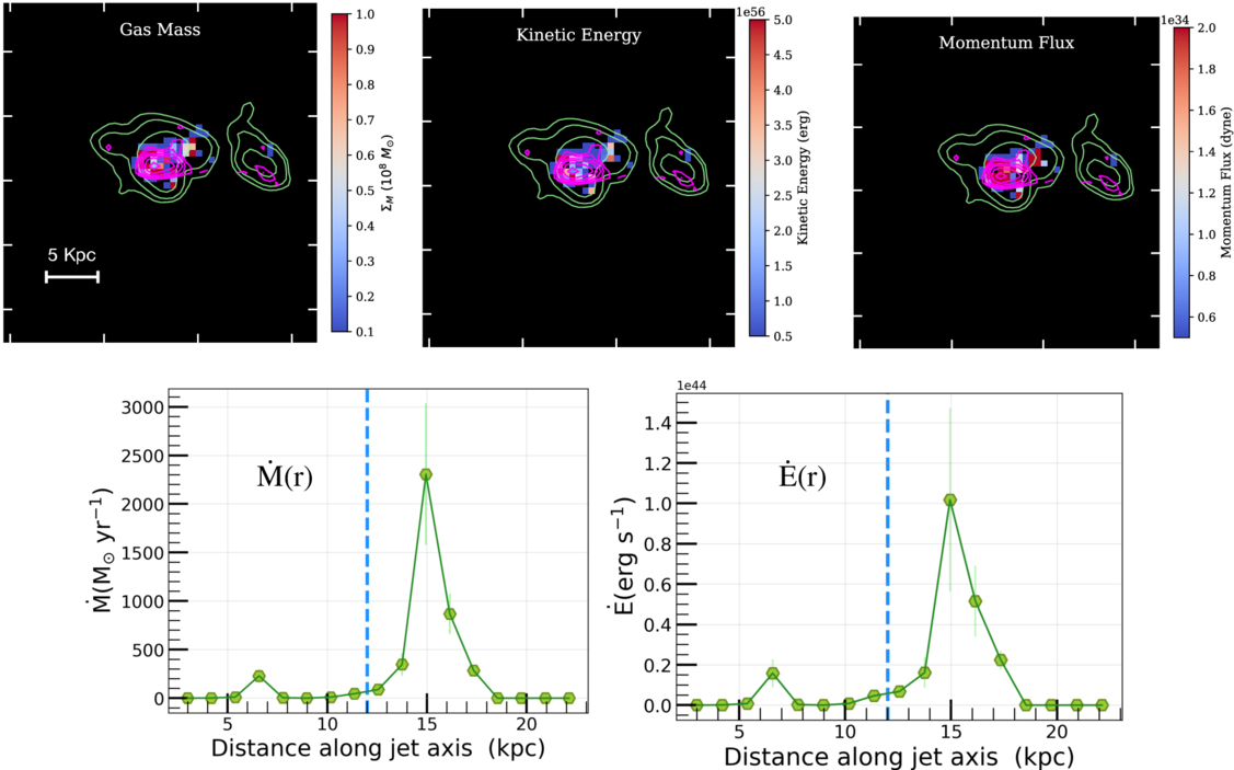 Same format as Figure 6, now shown for TN J0121+1320. The source exhibits a compact radio morphology, marked by the green star. The radial profiles reveal sharp enhancements in both the mass outflow rate and kinetic power at ∼15 kpc, closely corresponding to the radio position, though possibly slightly offset. Due to the unresolved radio morphology and lack of an extended jet axis, the jet-gas interaction is unclear.