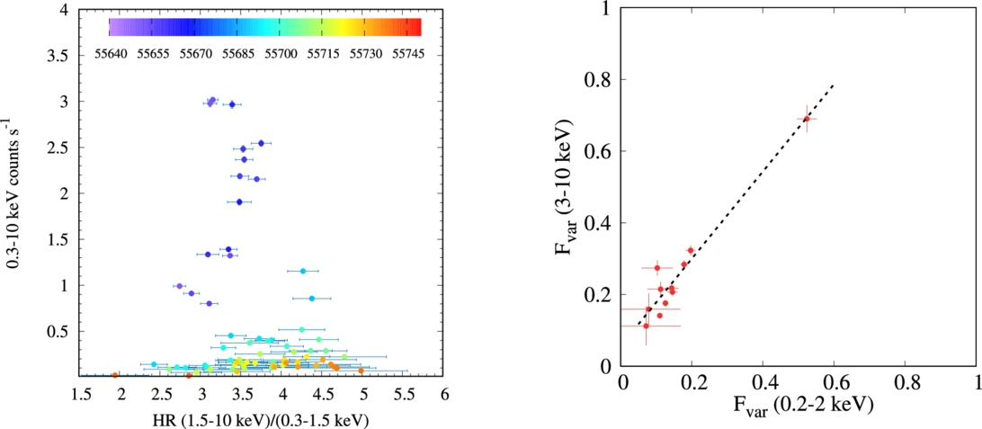 Left panel: The hardness ratio of Swift J1644+57 is presented. The source exhibited hard spectra throughout the TDE. The color bar on top represents the MJD from the start of the event. Right panel: The correlated variability between 0.2–2 and 3–10 keV is observed from XMM-Newton data. The Pearson correlation coefficient is 0.96.