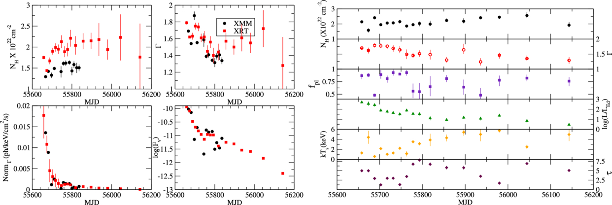 The variation in spectral parameters of Swift J1644+57 is presented for the powerlaw and optxagnf models. Only stacked Swift/XRT data are employed to fit the optxagnf model.