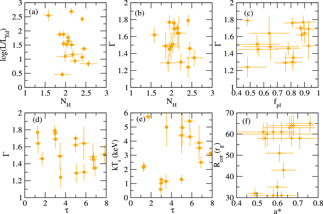 Optxagnf fitted spectral parameters variation with each other of Swift J1644+57 are presented. Panel (a) shows the variation in NH with respect to the normalized luminosity. The variation in NH with respect to Γ is shown in panel (b). Panel (c) demonstrates the weak correlation between Γ and scattering fraction fpl. Variation in Γ and τ can be observed in panel (d). Panel (e) presents the variation in Rcor and spin parameter. Uncorrelated variation between spin and Rcor can be observed in panel (e).