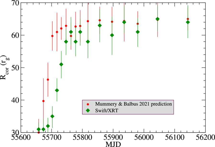Coronal variation with time is presented for Swift J1644+57. Swift/XRT fitted values are presented by green diamond points. The red circles denote the theoretical values of Rcor as predicted by A. Mummery & S. A. Balbus (2021).