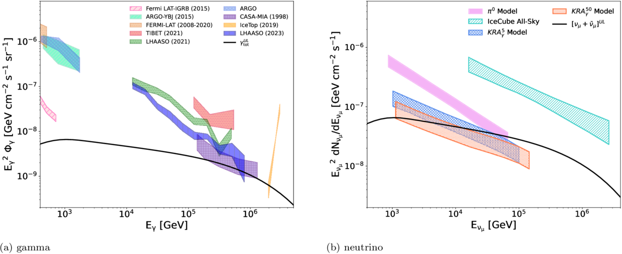 (a) Contribution from MSCs to gamma-ray emission, compared with observations of the diffuse Galactic gamma-ray emission (A. Borione et al. 1998; M. Amenomori et al. 2009, 2021; M. Ackermann et al. 2015; B. Bartoli et al. 2015; M. G. Aartsen et al. 2017; D. Grasso et al. 2017; Z. Cao et al. 2023; P. De La Torre Luque et al. 2023). (b) Muon neutrino flux from the combined contribution of the powerful and soft MSCs, compared with predictions of the diffuse Galactic neutrino flux and the IceCube sensitivity to neutrinos from the Galactic plane (IceCube Collaboration et al. 2020). The KRA γ models provide neutrino flux predictions based on gamma-ray data, assuming cutoff energies of 5 and 50 PeV (Icecube Collaboration et al. 2023). The π 0 model uses low-energy gamma-ray observations to estimate the neutrino flux, assuming that the same physical process produces both particles, with a smooth decay and no strong cutoffs (Icecube Collaboration et al. 2023).