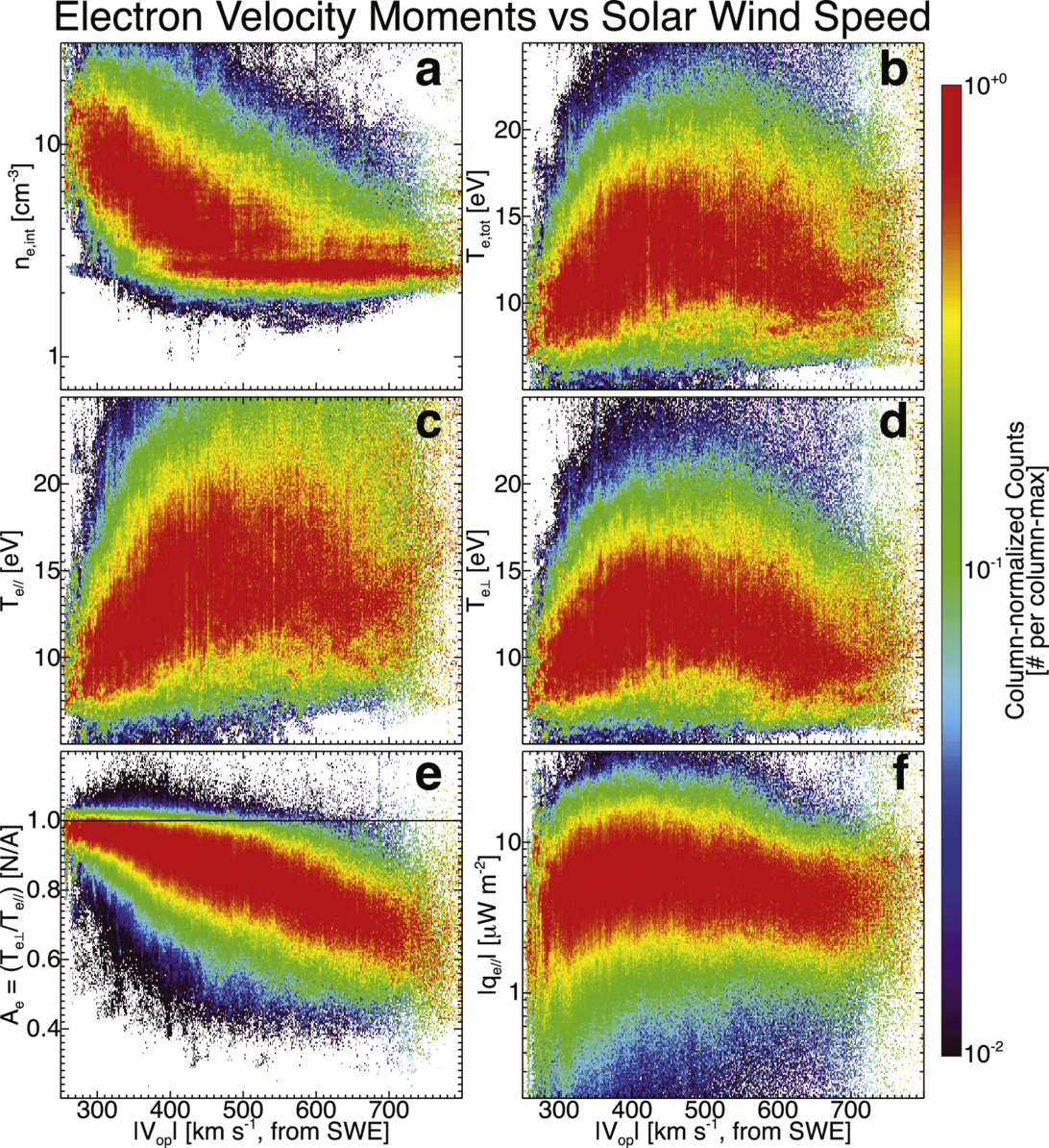 Calibrated electron velocity moments shown as 2D column-normalized histograms vs. the solar wind speed, ∣Vop∣. The panels are as follows: (a) ne,int [cm−3]; (b) Te,tot [eV]; (c) Te,∥ [eV]; (d) Te,⊥ [eV]; (e) Ae [N/A]; and (f) ∣qe,∥∣ [μW m−2]. The figure demonstrates the consistency with the results shown in Figure 8 of C. S. Salem et al. (2023). Panel (e) shows a solid black line at unity for convenience (see Appendix A for symbol definitions). Figure 6 in Appendix B provides a proper statistical reference.
