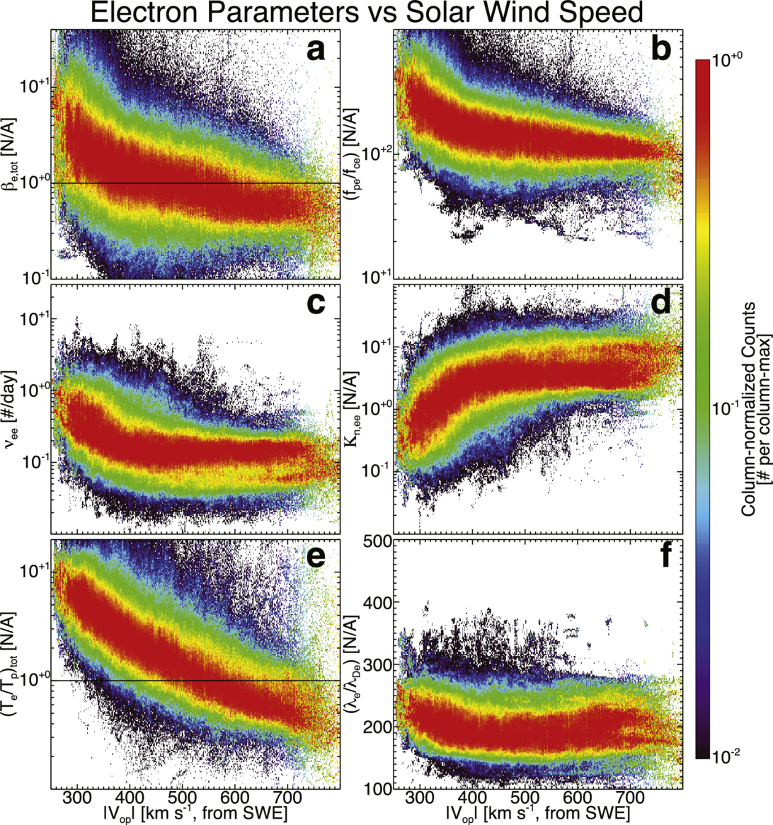 Similar to Figure 1, this figure shows various electron parameters vs. the solar wind speed, ∣Vop∣. The panels are as follows: (a) βe,tot [N/A]; (b) ﹩\frac{{f}_{{\rm{pe}}}}{{f}_{{\rm{ce}}}}﹩ [N/A]; (c) νee [# day−1]; (d) Kn,ee [N/A]; (e) ﹩\frac{{T}_{e,{\rm{tot}}}}{{T}_{p,{\rm{tot}}}}﹩ [N/A]; and (f) ﹩\frac{{\lambda }_{e}}{{\lambda }_{{\rm{De}}}}﹩ [N/A]. Panels (a) and (e) show a solid black line at unity for convenience (see Appendix A for symbol definitions). Figure 6 in Appendix B provides a proper statistical reference.