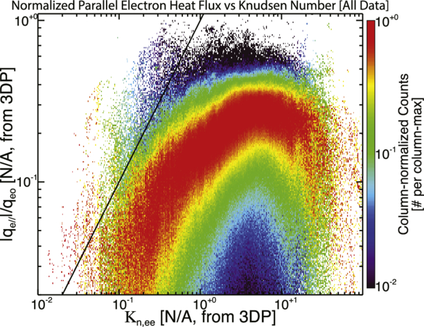 A 2D column-normalized histogram of the normalized, parallel electron heat flux, ﹩\frac{| {q}_{e,\parallel }| }{{q}_{eo}}﹩ [N/A], vs. the electron–electron Knudsen number, Kn,ee [N/A]. A straight line with a slope of 1 is shown for convenience, similar to the results of S. D. Bale et al. (2013; additionally, see Appendix A for symbol definitions).