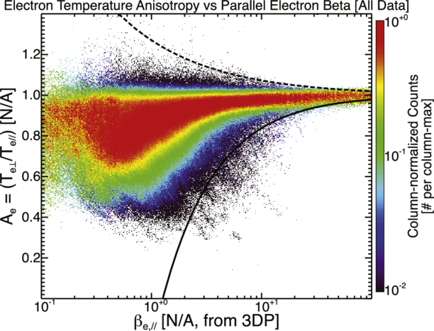 A 2D column-normalized histogram of the electron temperature anisotropy, Ae, [N/A], vs. the parallel electron plasma beta, βe,∥ [N/A]. Note that Appendix B provides Figure 6, which shows the distribution of data for each of these parameters so the reader can properly interpret the statistical significance of any given feature. We have overplotted the whistler anisotropy (dashed line) and electron firehose (solid line) instability thresholds for reference (e.g., S. P. Gary & J. Wang 1996; S. P. Gary & K. Nishimura 2003).