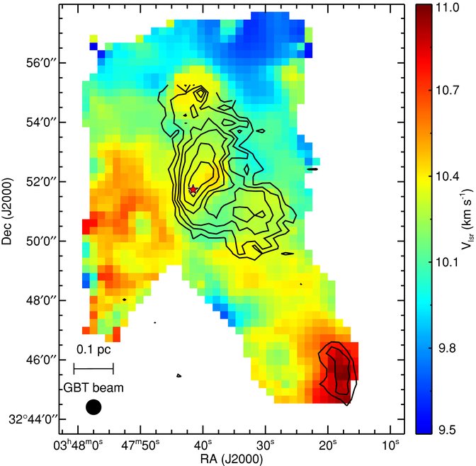 Centroid velocity map of B5 obtained by fitting the NH 3 lines. The position of the protostar is shown by the star. Black contours are BOLOCAM dust continuum emission (Enoch et al. 2006). The GBT beam size is shown at the bottom left.