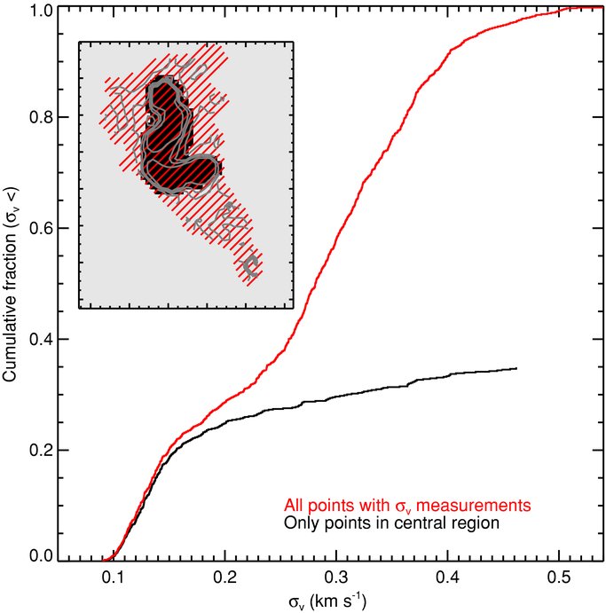 Velocity dispersion cumulative distribution. Red curve shows the cumulative distribution for all points with good velocity dispersion measurements, while the black curve uses only points close to the central core. The sharp transition in velocity dispersion produces a change in the cumulative distribution's slope, which can be observed both locally (central region) and globally (entire map). The inset shows the spatial distribution of the points used, and velocity dispersion contours are overlaid in gray.