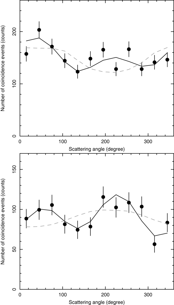 Number of coincidence gamma-ray photons (polarization signals) against the scattering angle of GRB 110301A (top) and GRB 110721A (bottom) measured by the GAP in the 70–300 keV band. Black filled circles are the angular distributions of Compton scattered gamma rays after the background subtraction. The solid lines are the best-fit models of each event calculated with the Geant4 Monte Carlo simulations. The model functions of the non-polarized cases are superposed on each panel for easy comparison.