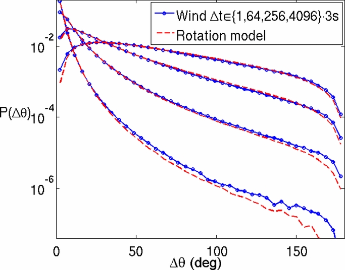 Comparison of the pdf for rotations measured in the solar wind (in blue) and the pdf derived from lognormal P(Δ B/ B) with the assumption that vectors undergo pure rotations (in red). The separations shown are Δ t ∈ {1, 16, 256, 4096} · 3 s.