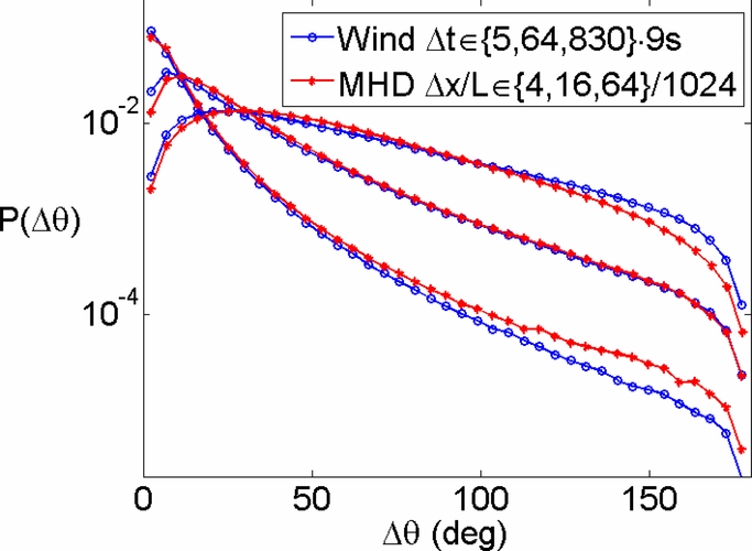 Comparison of the pdf's of Δθ for MHD turbulence (in red) with Δ x/ L ∈ {4, 16, 64}/1024 and for the solar wind (in blue) with Δ t ∈ {5, 64, 830} · 9 s, consistent with the relation Δ t ~ (Δ x) 1.85. There is generally good agreement in the pdf's for both cases.