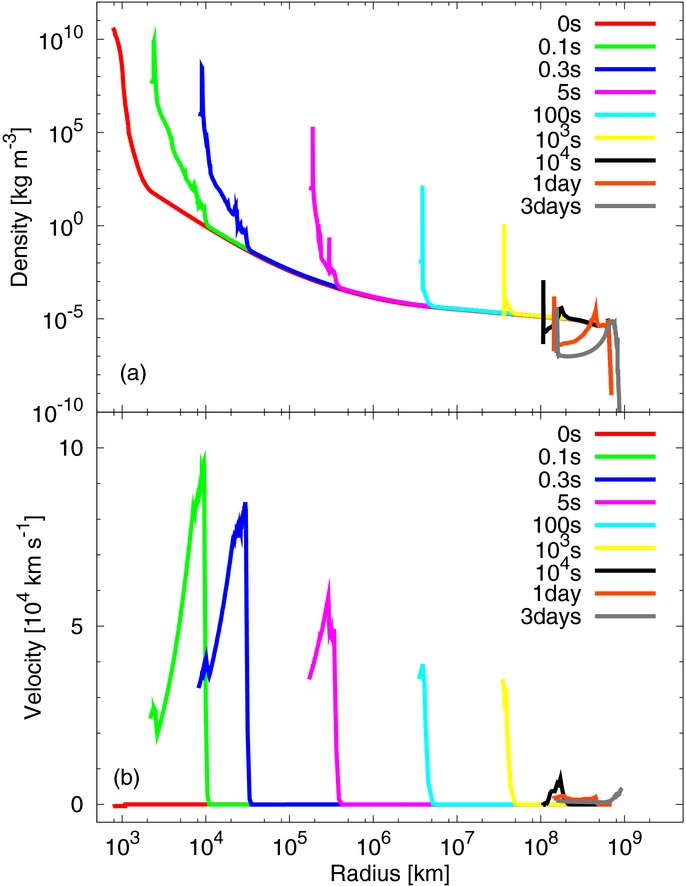 Density (a) and velocity (b) structures of the ECSN of the SAGB star with M env = 3.0 M ☉ and X env(H) = 0.2 at 0 s (red), 0.1 s (green), 0.3 s (blue), 5 s (magenta), 100 s (cyan), 10 3 s (yellow), 10 4 s (black), 1 day (orange), and 3 days (gray) after the core collapse.