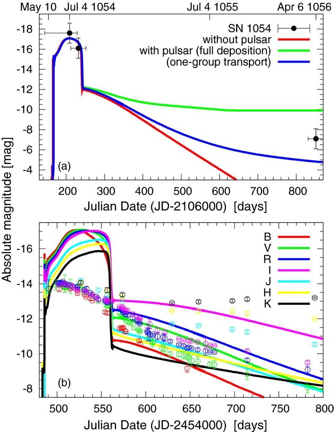 (a) Optical light curves of SN 1054 (black circles) and the ECSNe of the SAGB stars. The colors are the same as Figure 4(c). (b) Multicolor light curves of SN 2008S (red: B, green: V, blue: R, magenta: I, cyan: J, yellow: H, and black: K) are compared with those of the ECSN of the SAGB star with M env = 3.0 M ☉ and X env(H) = 0.2.
