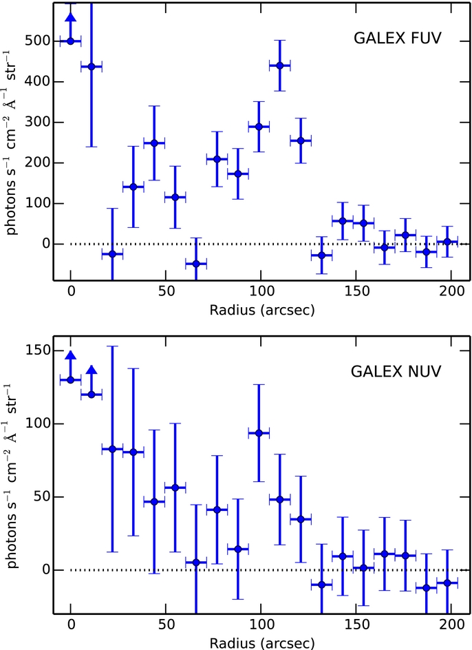 FUV (top panel) and NUV (bottom panel) background-subtracted surface brightness radial profiles. Surface brightness axis is limited to highlight the extended emission near ~100'', bins closest to the central point source emission are indicated with upward pointing arrows because their emission lies beyond the plot range.