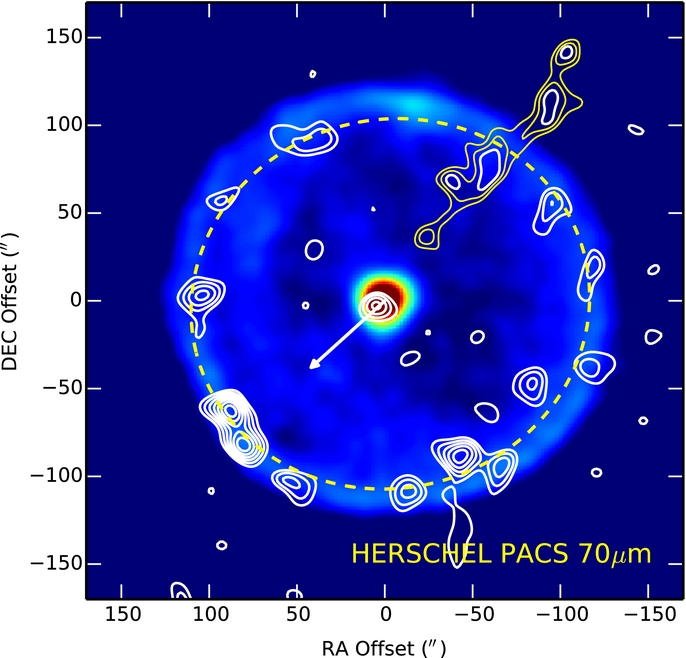 Dust shell of U Hya observed by Herschel PACS in 70 μm band with contours of the GALEX FUV emission overlaid. The yellow contours correspond to the faint spoke-like feature discussed in Section 4.4. The proper motion vector is indicated along with the best-fit ellipse for the bright FUV points.
