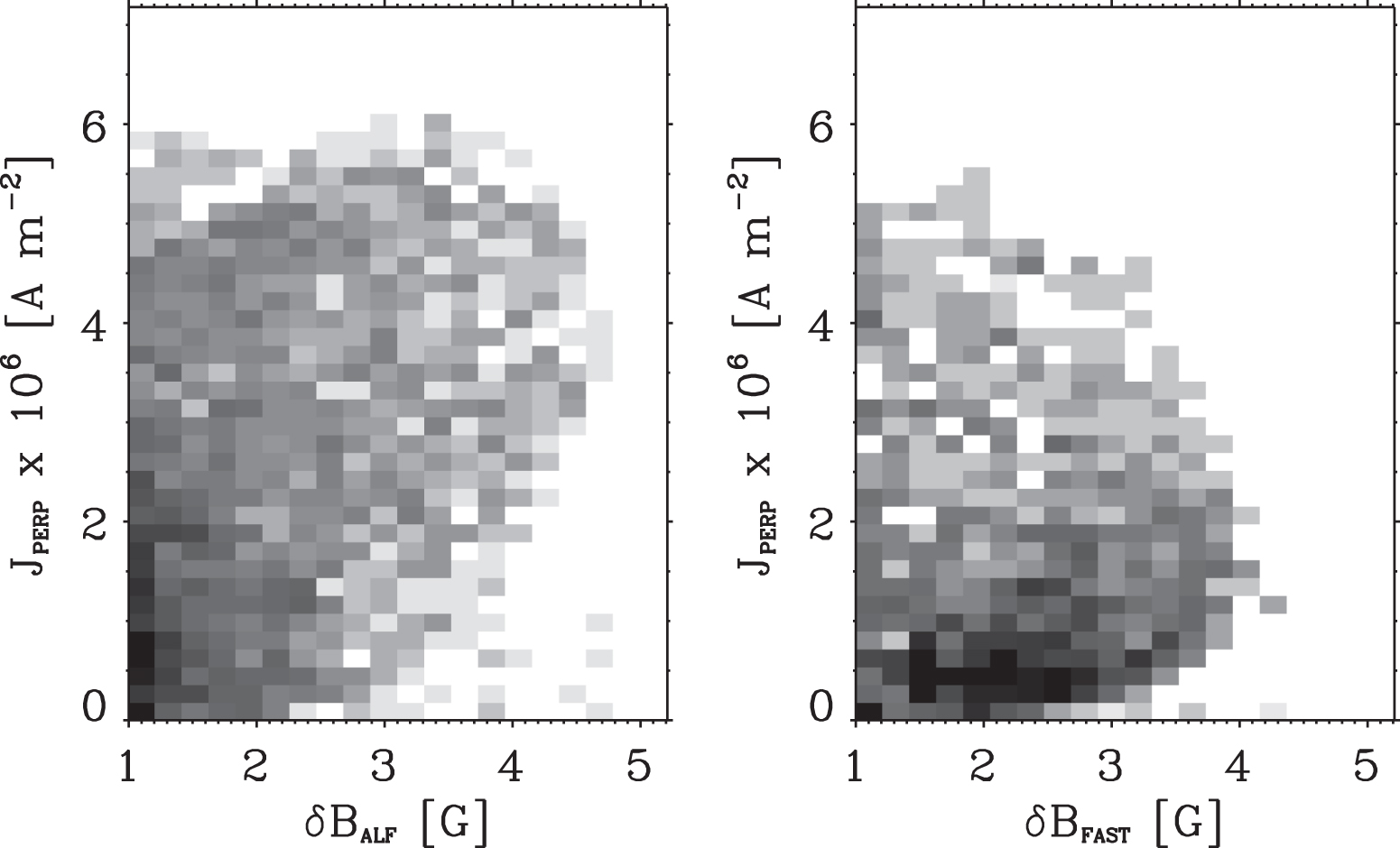 Occurrence plots of the perpendicular current ﹩{J}_{\perp }﹩ vs. the amplitude of the magnetic field fluctuation due to the Alfvén wave (left) and the fast wave (right). The magnetic field fluctuations were obtained using the projections of the magnetic field perturbations onto the directions, given by Equations (13)–(15).