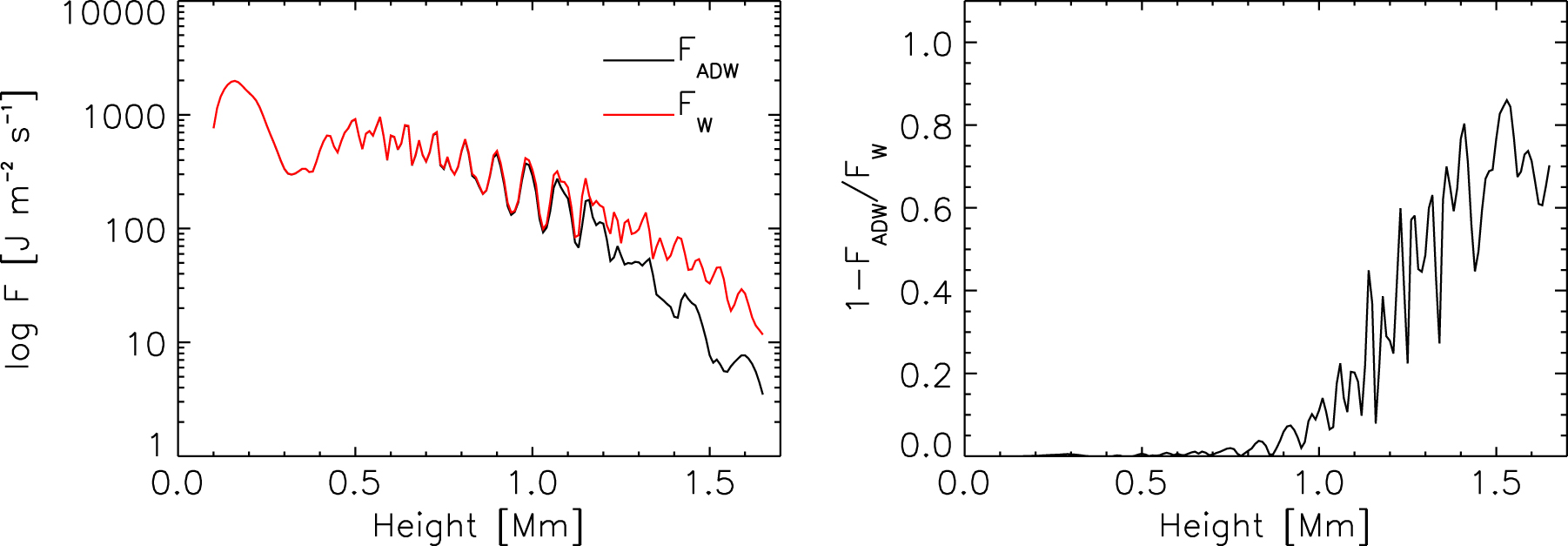 Poynting flux absorption. Left panel: height dependence of temporally and horizontally averaged Poynting flux for the W simulation (FW, red curve) and for the ADW simulation with the wave source and ambipolar diffusion term (FADW, black curve). Right panel: dependence of Poynting flux absorption ﹩1-{F}_{{ADW}}/{F}_{W}﹩ on height in the simulation.