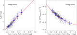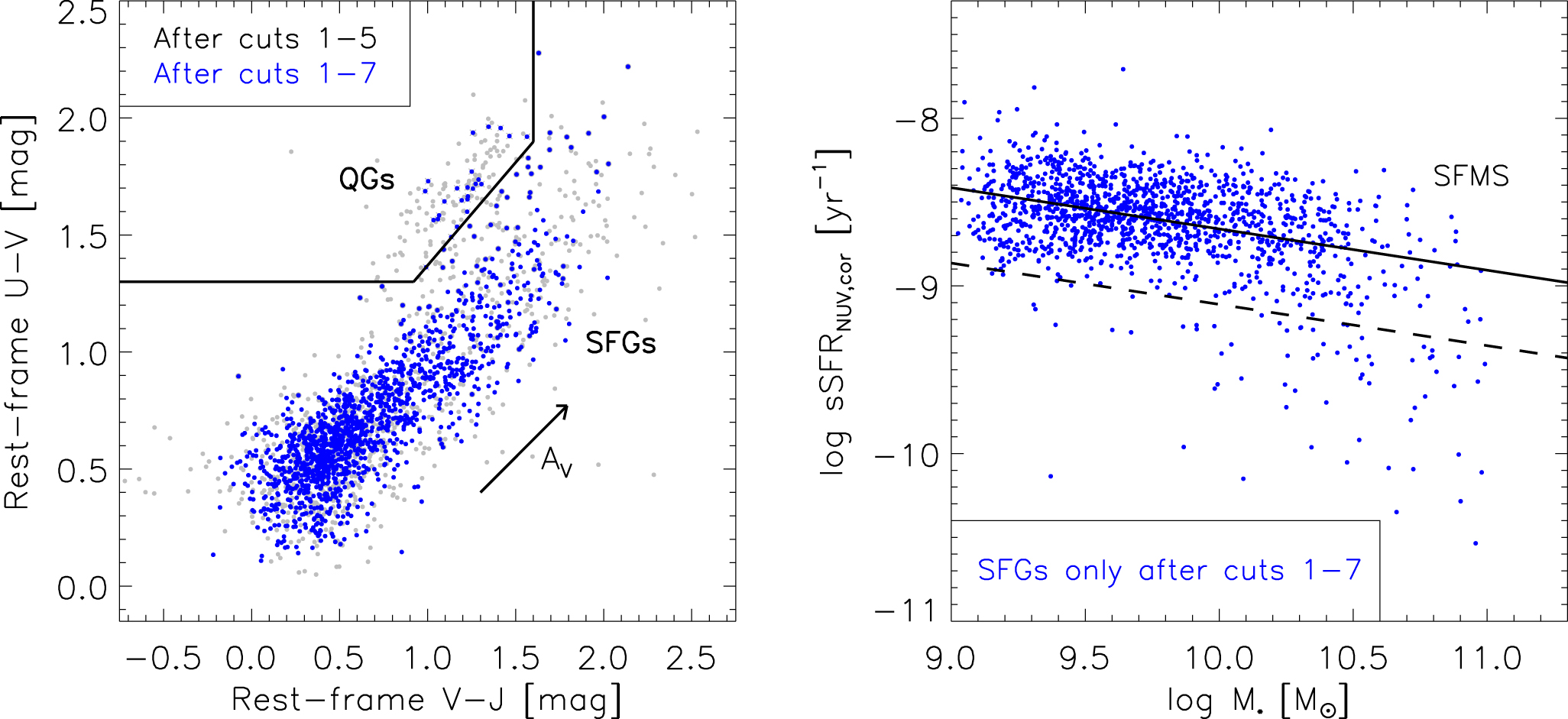 Left panel: rest-frame global UVJ diagram for the parent samples after applying selection cuts 1–5 and 1–7 (see Section 1), respectively. The solid lines indicate the classification criterion provided by Williams et al. (2009). The arrow shows the Calzetti vector. Right panel: sSFR vs. stellar mass for only UVJ-defined SFGs after cuts 1–7. The solid line shows the best-fit linear relation to the SFMS. The transition galaxies, defined as having residuals ﹩{\rm{\Delta }}\,\mathrm{log}\,{\mathrm{sSFR}}_{\mathrm{NUV},\mathrm{cor}}\lt -0.45\,\mathrm{dex}﹩ (below the dashed line), are excluded in this analysis.