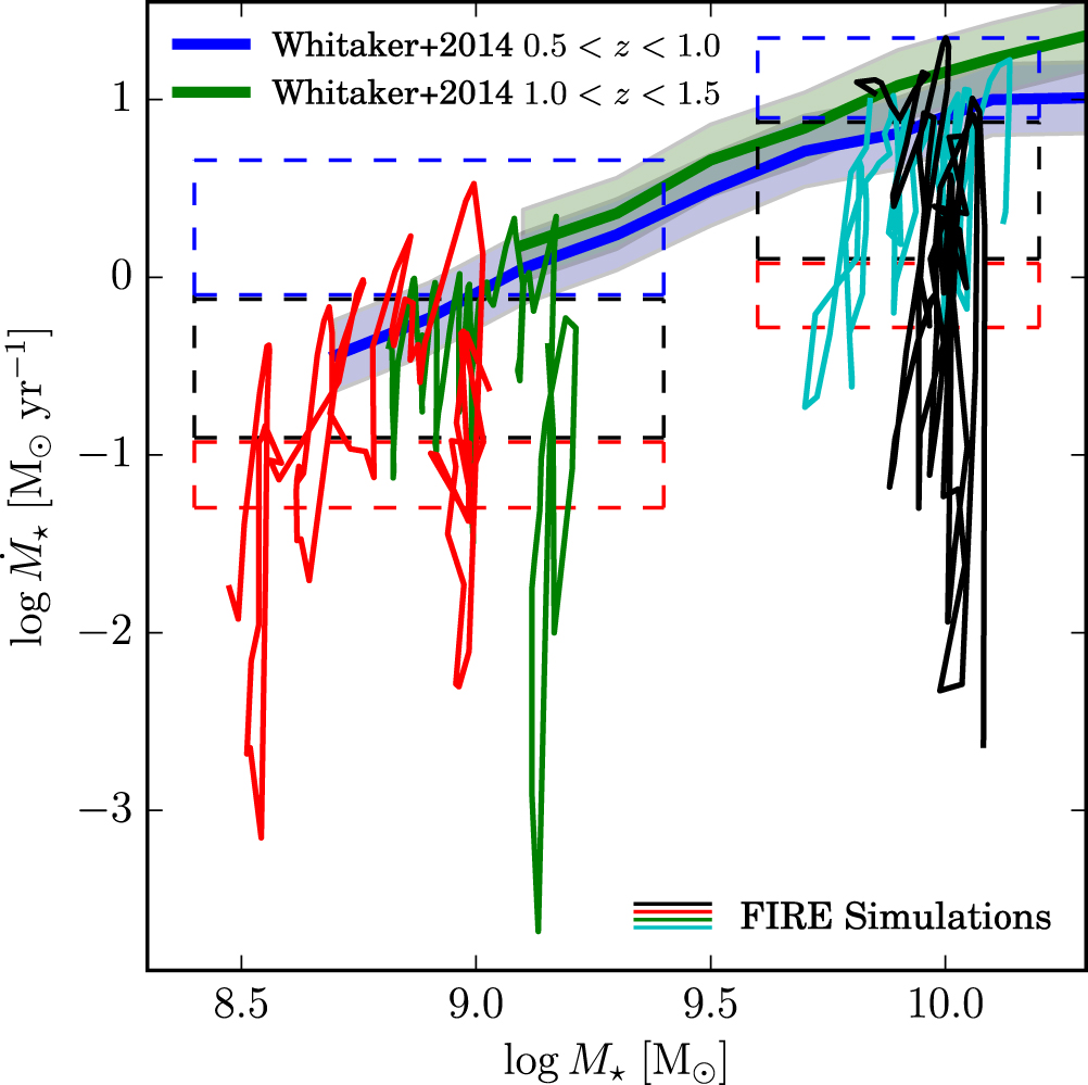 Tracks of two individual galaxy runs from each M⋆ bin (individually colored) in the SFR–﹩{M}_{\star }﹩ plane for ﹩0.7\lt z\lt 1.5﹩. ﹩{\dot{M}}_{\star }﹩ is the 100 Myr averaged SFR within the central 20 kpc of each main halo; ﹩{M}_{\star }﹩ is calculated within the same aperture. Solid blue (green) lines indicate the “star formation main sequence” (MS) in the redshift interval ﹩0.5\lt z\lt 1.0﹩ (﹩1.0\lt z\lt 1.5﹩) found by Whitaker et al. (2014); the shaded regions represent the intrinsic scatter of 0.2 dex found by Speagle et al. (2014). The dashed colored boxes indicate the cuts used in this work to classify galaxies as above (blue), on (black), or below (red) the MS. At these redshifts, FIRE galaxies have rapidly changing SFRs and do not evolve parallel to the MS but rather cross it many times.