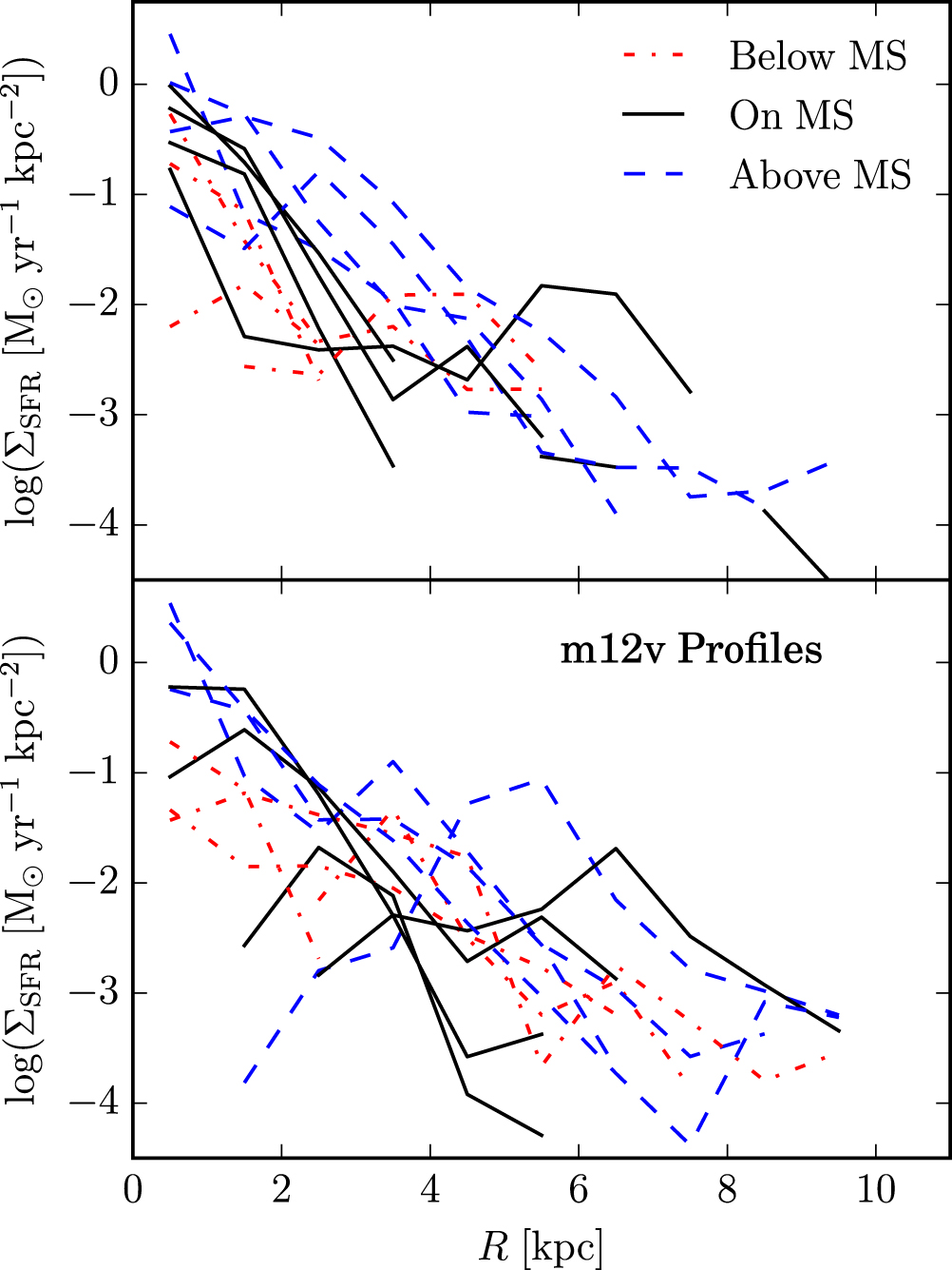 Top: SFR surface density profiles of randomly selected individual snapshots (at ﹩0.7\lt z\lt 1.5﹩) with ﹩9.6\lt \mathrm{log}({M}_{\star }/{M}_{\odot })\lt 10.2﹩, including those above (blue dashed), on (black solid), and below (red dashed–dotted) the MS (four of each type). Error bars have been omitted for clarity. The (10 Myr averaged) SFR profiles of galaxies above (below) the MS are not systematically above (below) those of MS galaxies. Moreover, in some cases, the profiles peak at large radii. Bottom: consistent results are seen for randomly selected snapshots of a single galaxy run, “m12v”, in the same redshift and mass bins. Stacking reflects the fact that star formation in the simulated galaxies is coherent in a time-averaged sense even though individual galaxies evolve in a bursty manner and not parallel to the MS.