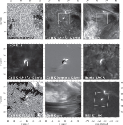 Different imaging diagnostics for the 2016 September 3 data set. The top row shows large field of view (FOV) overview images. The white box in the top row and the IRIS SJI 1400 image in the lower right marks the area centered on the UV burst shown in more detail in the SST images in the bottom rows. All images are shown with coordinates of the CHROMIS FOV, except the IRIS SJI 1400 image, which has heliocentric–Cartesian coordinates. The white arrow marks an isolated plasmoid-like blob. An animated version of the bottom two rows is available.