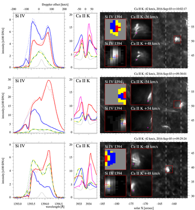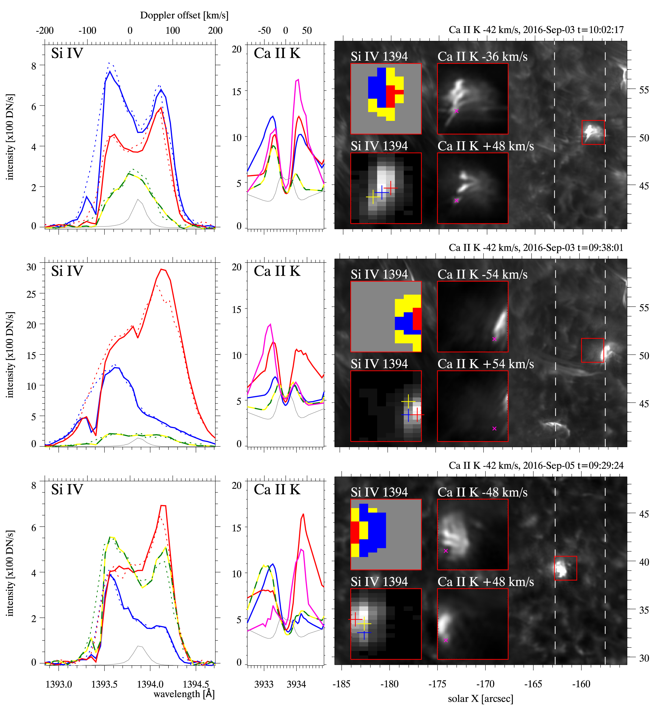 UV burst spectral profiles and diagnostics. The left two panels show spectral profiles at three different spatial locations marked with three different colors: blue, red, and green/yellow, all recorded during the same IRIS raster time. The three different spatial locations are in close proximity of each other; their locations are marked with crosses in the inset Si IV raster maps in the right panels. The solid lines in the left panels are for Si IV 1394 Å and the dotted lines are Si IV 1403 Å profiles, shifted in wavelength and multiplied by a factor of 2 to compensate for the difference in the atomic transition’s oscillator strength. The right panels show Ca II K profiles in arbitrary units and averaged over the IRIS pixel. The pink profile is from a CHROMIS pixel in a plasmoid marked with a pink cross in the Ca II K insets in the right panels. The thin gray profiles are average spectral profiles for reference, the average Si IV 1394 Å profile is multiplied by a factor 10 for clarity. The wide right panel is a Ca II K wing reference image, the vertical dashed lines mark the IRIS raster extent. The red box outlines the region for which inset images are shown at higher magnification. The lower left Si IV 1394 Å map is integrated intensity over the full spectral window, in the top left map colors mark Si IV profile classification: red/blue pixels have strong (﹩\gt 30﹩ km s−1) redshifted/blueshifted components, and yellow have broad or triangular non-Gaussian profiles.