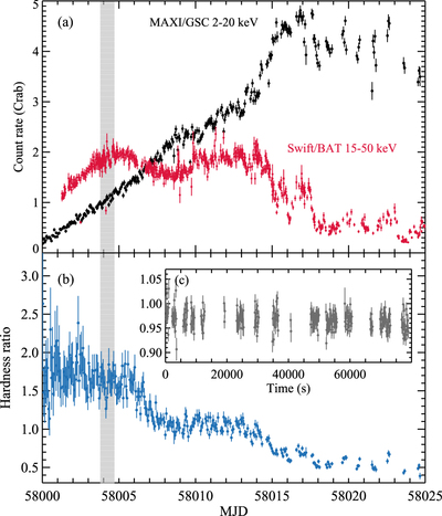 (a) MAXI/GSC (black) and Swift/BAT (red) orbital light curves of MAXI J1535-571, scaled to the Crab count rates in the corresponding instrument bands (only BAT data points with S/N > 7 are included). The gray shaded area marks the duration of the NuSTAR observation. (b) MAXI hardness ratio calculated from count rates (4–20/2–4 keV). (c) NuSTAR hardness ratio in 100 s bins (count rates, 6–10/3–6 keV).