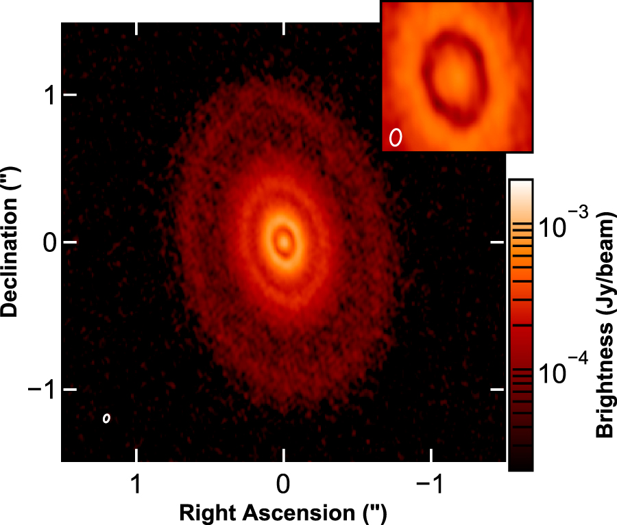 CLEANed image of the continuum emission obtained from our gas and dust hydrodynamical simulation containing three planets. This synthetic image was produced with the same noise level as in the observations and using the same imaging parameters used in Figure 1.
