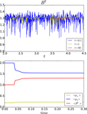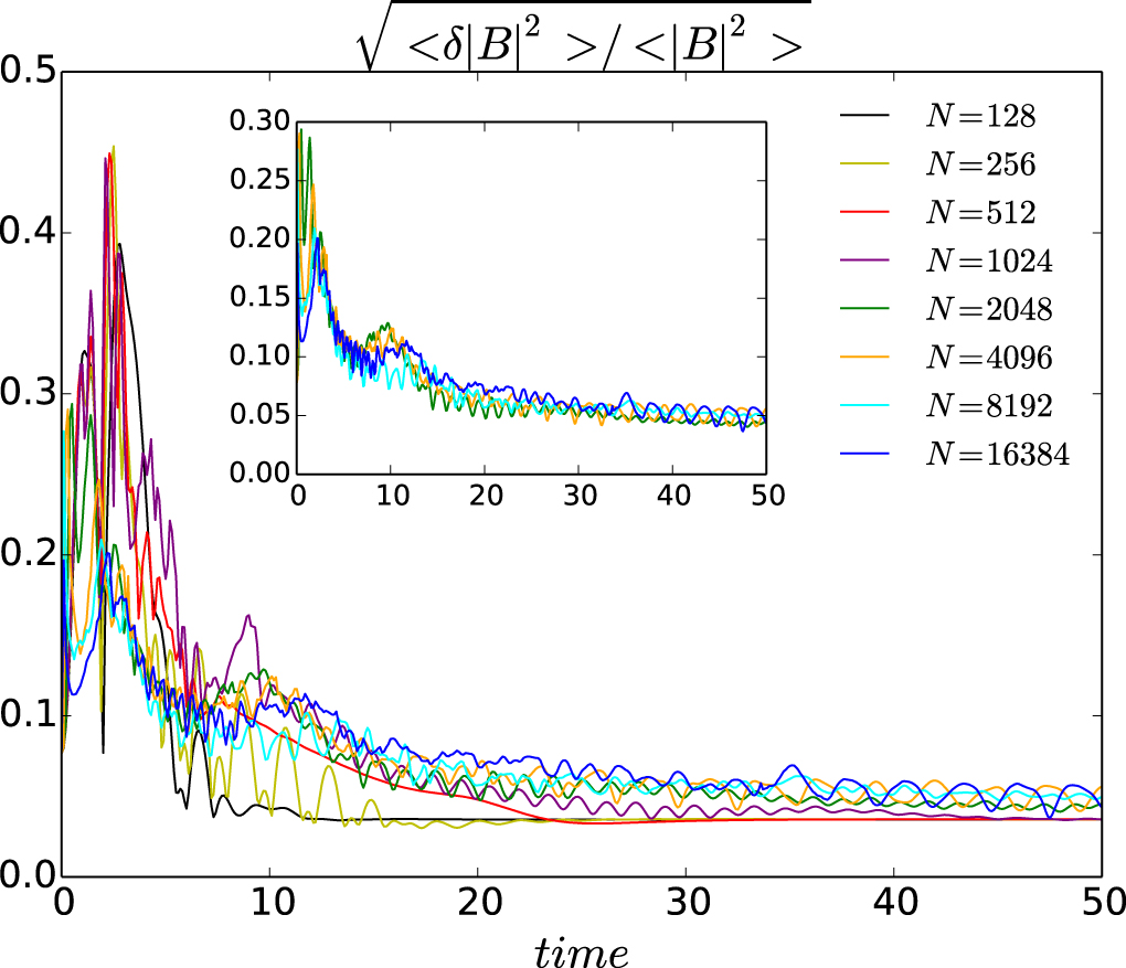 Nonlinear relaxation of an Alfvénic fluctuation (θ0 = 0). Normalized rms amplitude vs. time for each simulation; high-resolution simulations are shown in the inset plot.