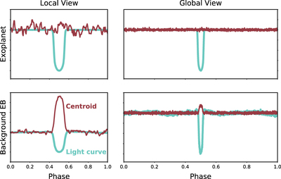 Local (left) and global (right) views of the light curves (cyan) and centroids (maroon) for an example confirmed planet (top) and background eclipsing binary (bottom), illustrating how the centroid curves can be used to identify a common type of astrophysical false positive.