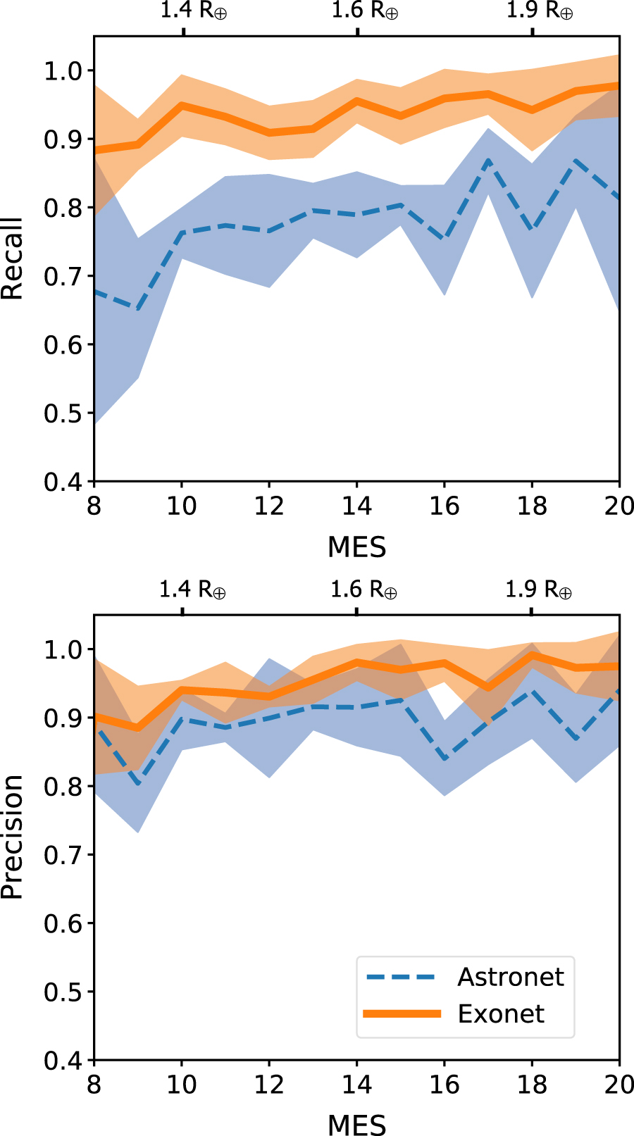 Recall (top) and precision (bottom) as a function of MES, which is a measure of the signal-to-noise of candidate transits. The Kepler pipeline only reports MES > 7.1 and the cross-validation k-folds sometimes did not contain any planets with MES < 8, thus here we only plot MES ≥ 8. The solid lines are the averages of the cross-validation k-fold results, while the shaded regions show their standard deviations. We use a threshold of 0.7 to calculate the individual recall and precision values. The top axes show the median planet radius for confirmed/candidate KOIs in three MES bins, illustrating that the gains in performance by Exonet can be most significant for Earth-sized planets.