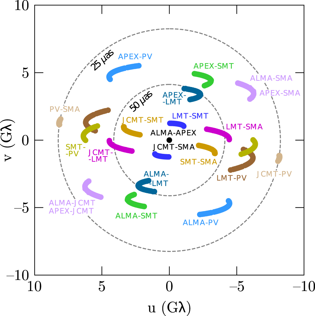 Aggregate EHT baseline coverage for M87 over four nights of observing with the 2017 array. Only detections are shown. The dashed circles show baseline lengths corresponding to fringe spacings of 25 and 50 μas. See Paper III for details.