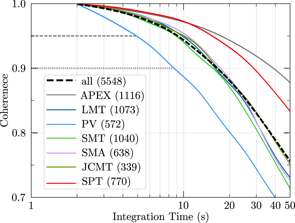 Atmospheric coherence time for EHT ALMA baselines. VLBI observations consist of scans, each ∼3–7 minutes long (see Figure 12). Each scan in the 2017 EHT observation campaign was divided into sequential coherent integration intervals, which were then incoherently averaged to obtain an estimate of VLBI signal amplitude per scan. As the duration of the coherent interval decreases, the loss in amplitude due to atmospheric phase fluctuations decreases. Solid lines represent the 25th percentile of the coherence distribution for each baseline: 75% of the data exhibit higher time coherence than indicated by the line. The heavy black dashed line shows the 25th percentile of the coherence distribution for all baselines. The light dashed and dotted lines show the 95 % and 90 % coherence limits for the baseline with lowest coherence, which is from PV to ALMA (largely due to low-elevation PV scans on Sgr A* during the observations). The number of scans used to compute the coherence curves are shown next to each station in parenthesis.