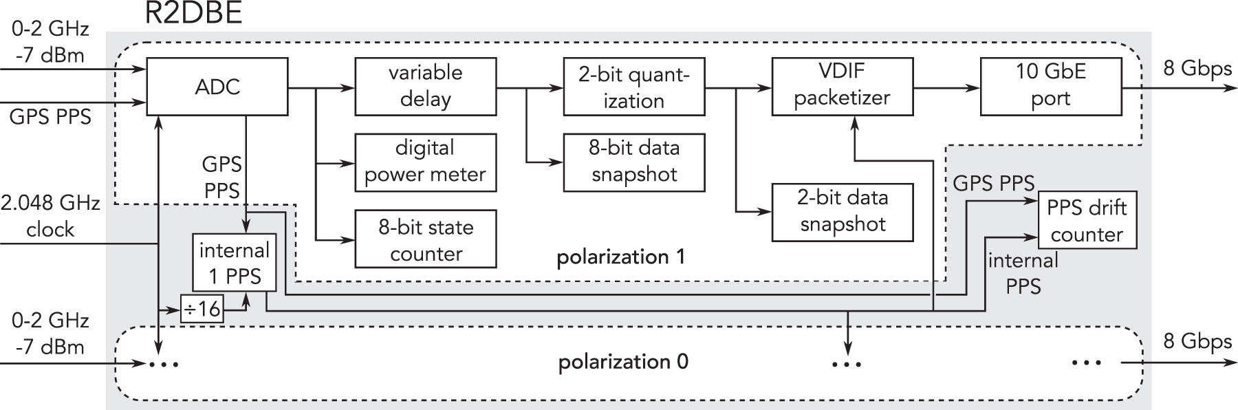 Functional diagram of the R2DBE. A pair of ADCs sample two channels of 2.048 GHz Nyquist bandwidth IF bands, typically representing two antenna polarizations. After requantization of the samples to 2 bits, the data are distributed in VDIF packets over a 10 GbE network to Mark 6 recorders. The maximum FPGA clock speed is too slow to process the ADC output stream rate of 4096 megasamples per second in series, so 16 ADC samples are transferred from the sampler in parallel on each FPGA clock cycle and are processed in parallel though the FPGA, which is clocked at a sixteenth of the sample clock, or 256 MHz. The FPGA and sampler clocks are locked to the maser reference frequency. In addition to the sample clock and dual IF inputs, each ADC circuit board is also equipped with a low-frequency synchronization input. On one of the ADC boards, the synchronization input is connected to GPS PPS. An internal PPS for VDIF time stamping is synthesized from the 2.048 GHz maser-referenced clock and synchronized to the GPS real-time PPS time-tick once at the beginning of an observation. The internal PPS drift relative to GPS real-time PPS (Figure 5) is measured by a counter and is available to be read from a register over Ethernet, as well as copied into the VDIF data-header, as it is a prior parameter for VLBI correlation.