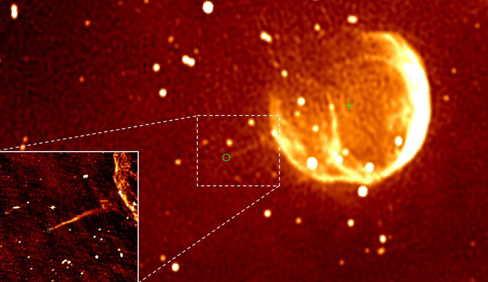 Total intensity image of the SNR CTB 1 from CGPS at 1.42 GHz. False colors start at brightness temperatures of 5.5 K and the maximum is at 8.9 K. The angular resolution and field of view are approximately 1′ and 1.°9 × 1.°1, respectively. A green cross marks the location of the geometric center of the SNR (Landecker et al. 1982), while circles indicate the position of PSR J0002+6216 (Clark et al. 2017). A faint tail of emission is visible from the PSR to the SNR, pointing back toward the geometric center. The inset is our higher angular resolution 20 cm VLA image of the dashed region taken from Figure 3.