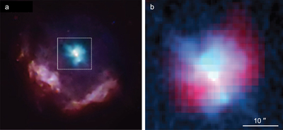 Panel (a): Chandra X-ray image of Kes 75 with the soft thermal emission shown in violet and hard nonthermal emission from the PWN shown in blue (NASA/CXC/GSFC/Gavriil et al. 2008). The region in the white rectangle is zoomed-in in panel (b). Panel (b): zoomed-in view of the PWN in Kes 75 with the nonthermal Chandra X-ray emission shown in blue and the Herschel 70 μm emission shown in red. The IR emission seems to be distributed in two lobes along the equatorial region of the PWN, perpendicular to the pulsar’s jets (also see Figure 2).