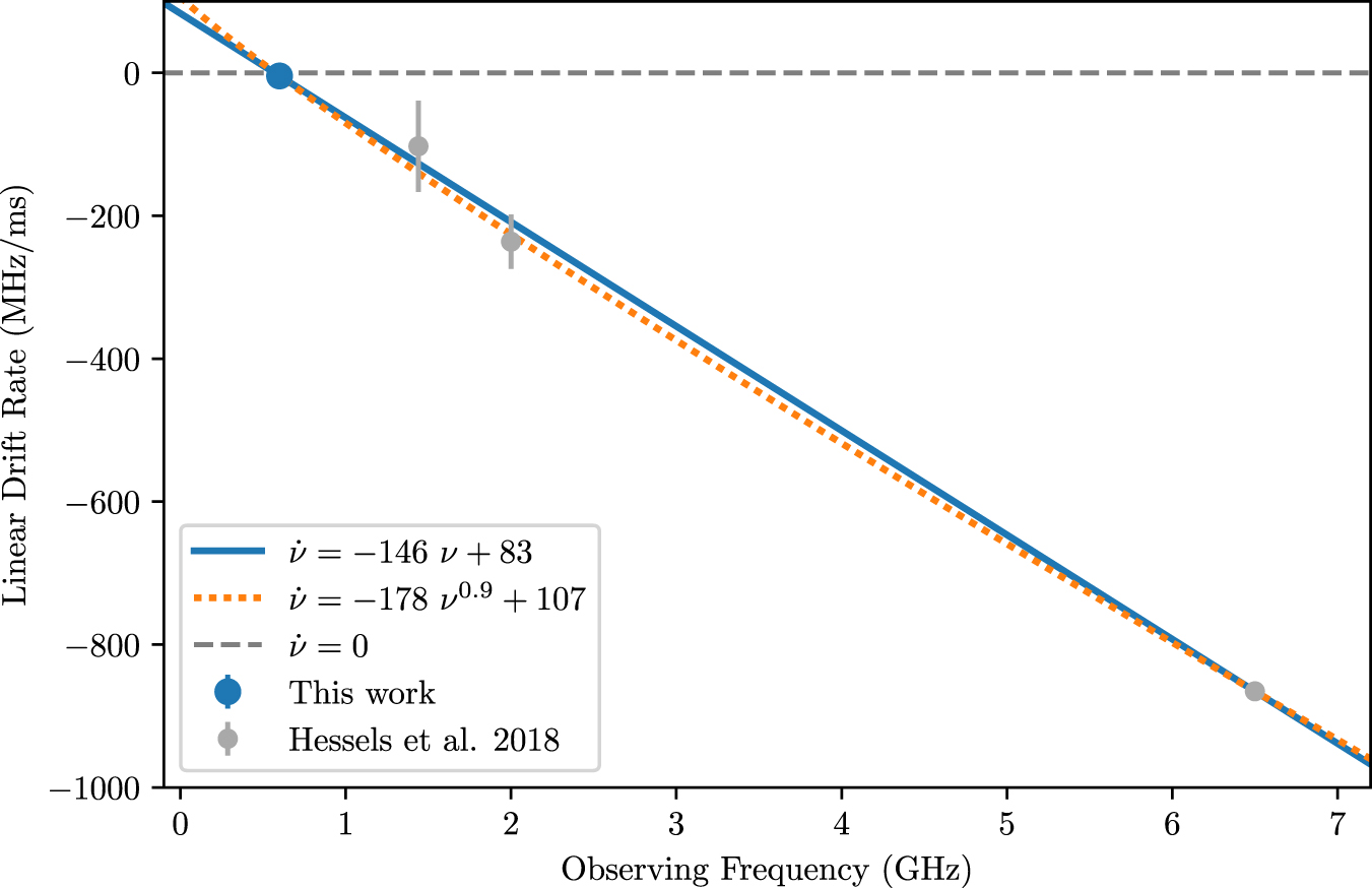 Comparison of FRB 121102's CHIME/FRB burst drift rate with rates measured by Hessels et al. (2019) at higher observing frequencies. Where multiple bursts are detected with the same instrument (at 1.4 and 2.0 GHz), the weighted average and standard deviation are taken at the central frequencies of the receiver bandwidth and error bars reflect the scatter in the measurements, while the error bars at 600 MHz and 6.5 GHz reflect the measurement errors. Over this frequency range, the drift rate evolves roughly linearly with ∼−150 MHz ms−1 GHz−1.