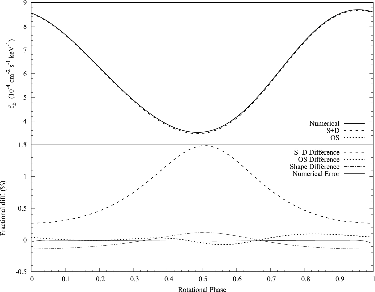 Comparison of flux measured at 1 keV for the S+D and OS approximations and the exact numerical waveform for one sample star. The example star spins with a frequency of 200 Hz, has M = 1.44 M⊙, Req = 11.41 km. The upper panel shows waveforms computed using the S+D and OS approximations, as well as the exact numerical waveform. The lower panel shows the percent difference between the approximate and exact solutions.