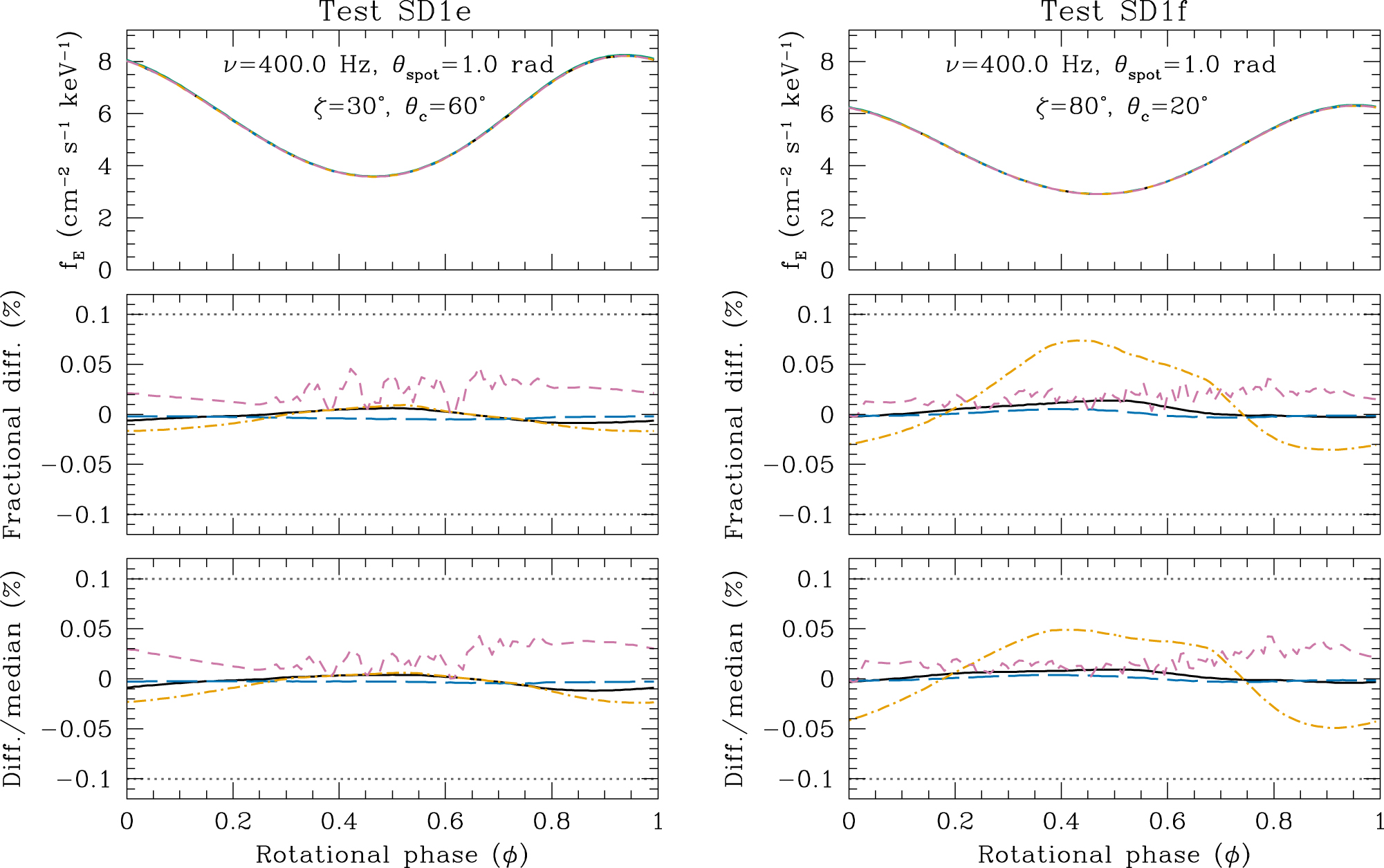 Same as Figure 5 but for comparisons of the synthetic pulse waveforms from Tests SD1e and SD1f, which consider a rapidly spinning (400 Hz) neutron star and more general combinations of colatitude and viewing angle.