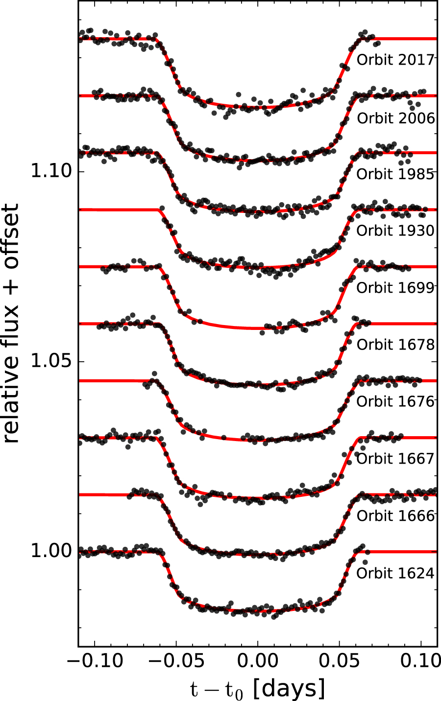 Transit light curves of WASP-12b, based on ﹩r^{\prime} ﹩-band observations with the FLWO 1.2 m telescope. The red curves are based on the best-fitting model. The number on the right side of each light curve is the orbit number relative to a fixed reference orbit.