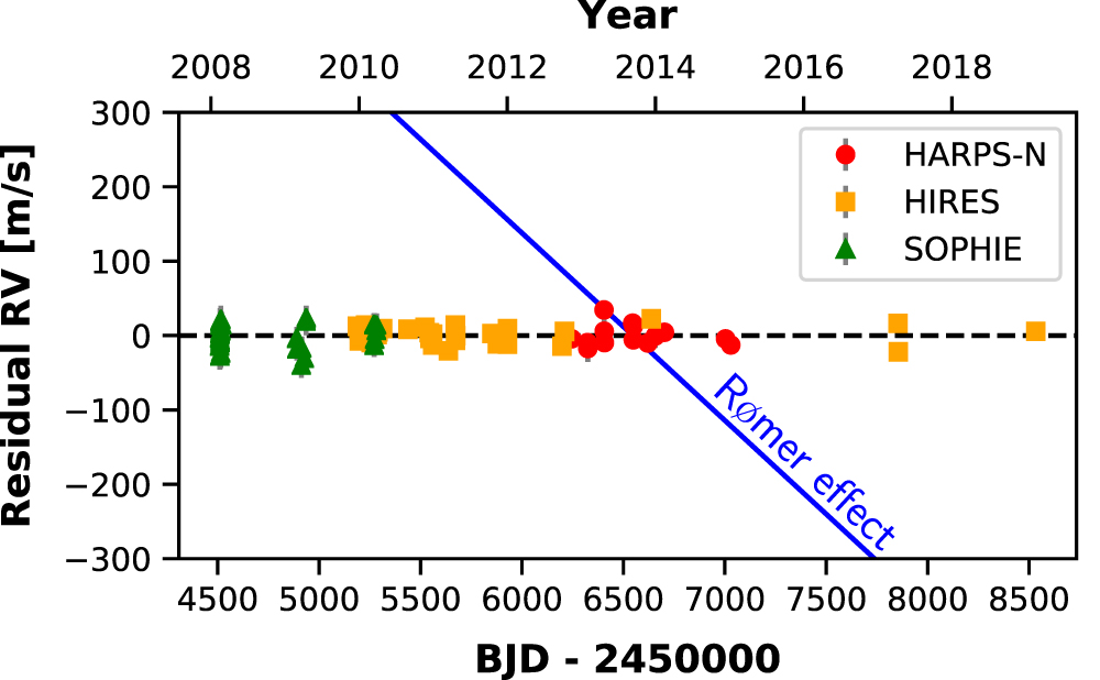Radial velocity residuals after subtracting the best-fitting sinusoidal model. No significant trends are seen in the residuals. The blue line has the slope that would have been observed, if the Rømer effect were solely responsible for the observed period derivative.