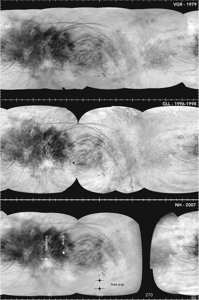 Global image maps of Europa at ∼6 km pixel−1 scales. VGR, GLL, and NH. The NH map shows locations of proposed plume sites on Europa (Roth et al. 2014; Sparks et al. 2017; Jia et al. 2018). Global maps use these coordinates throughout.