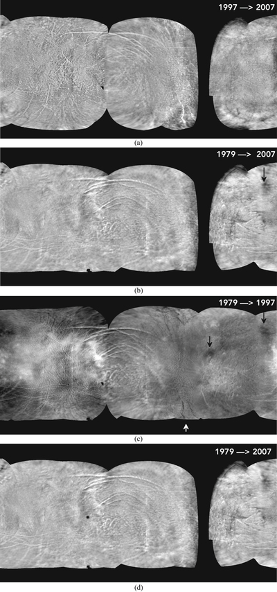 (a) The 1997–2007 Δt ratio map of Europa, highlighting potential changes in the GLL-to-NH epoch. The map was created by ratioing global image maps from GLL and NH (see Figure 1), with an additional 1000 km-wide highpass filter to suppress global-scale photometric artifacts. The tiny bright spot at center left is the fresh bright ray crater Pwyll. Bright spots and arcuate lines are known chaos units and dark reddish double ridges that appear in the ratio maps due to differences in contrast in the different imaging data sets used. (b) The 1979–2007 Δt ratio map of Europa, highlighting potential changes in the VGR-to-NH epoch. The map was created by ratioing global image maps from VGR and NH (see Figure 1), with an additional 1000 km-wide highpass filter to suppress global-scale photometric artifacts. Arrows indicate smaller artifacts discussed in the text. (c) The 1979–1997 Δt ratio map of Europa, highlighting potential changes in the VGR-to-GLL epoch. Map created by ratioing global image maps from VGR and GLL (see Figure 1), with an additional 1000 km-wide highpass filter to suppress global-scale photometric artifacts. Arrows indicate smaller artifacts discussed in the text. (d) The 1979–2007 Δt ratio map of Europa (from Figure 3(b)), with a false synthetic 125 km wide bright plume deposit added to original VGR mosaic at the E12 GLL magnetometer detection site (small dark spot at center left) to test detectability of surface changes.