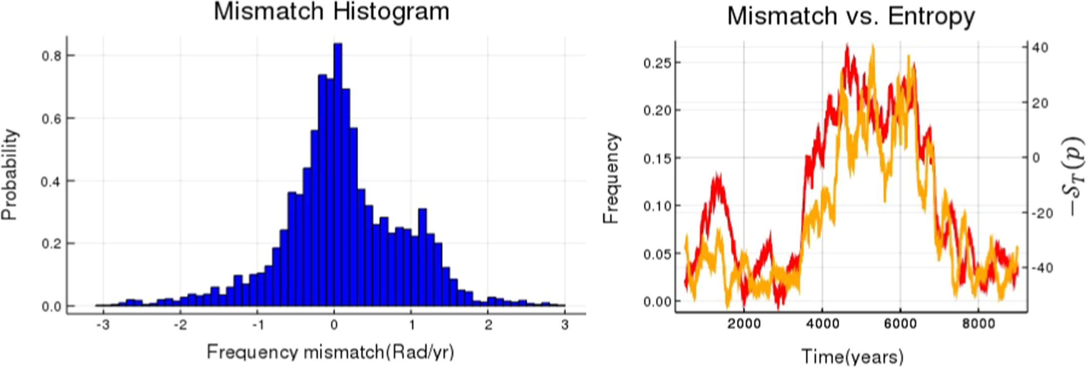 Histogram of the instantaneous frequency mismatch δω referred to the same numerical solution of Figure 1 (left panel). It is evident that the system has a bimodal character. The evolution of the Shannon Entropy of the system compared with the frequency mismatch curve (right panel).