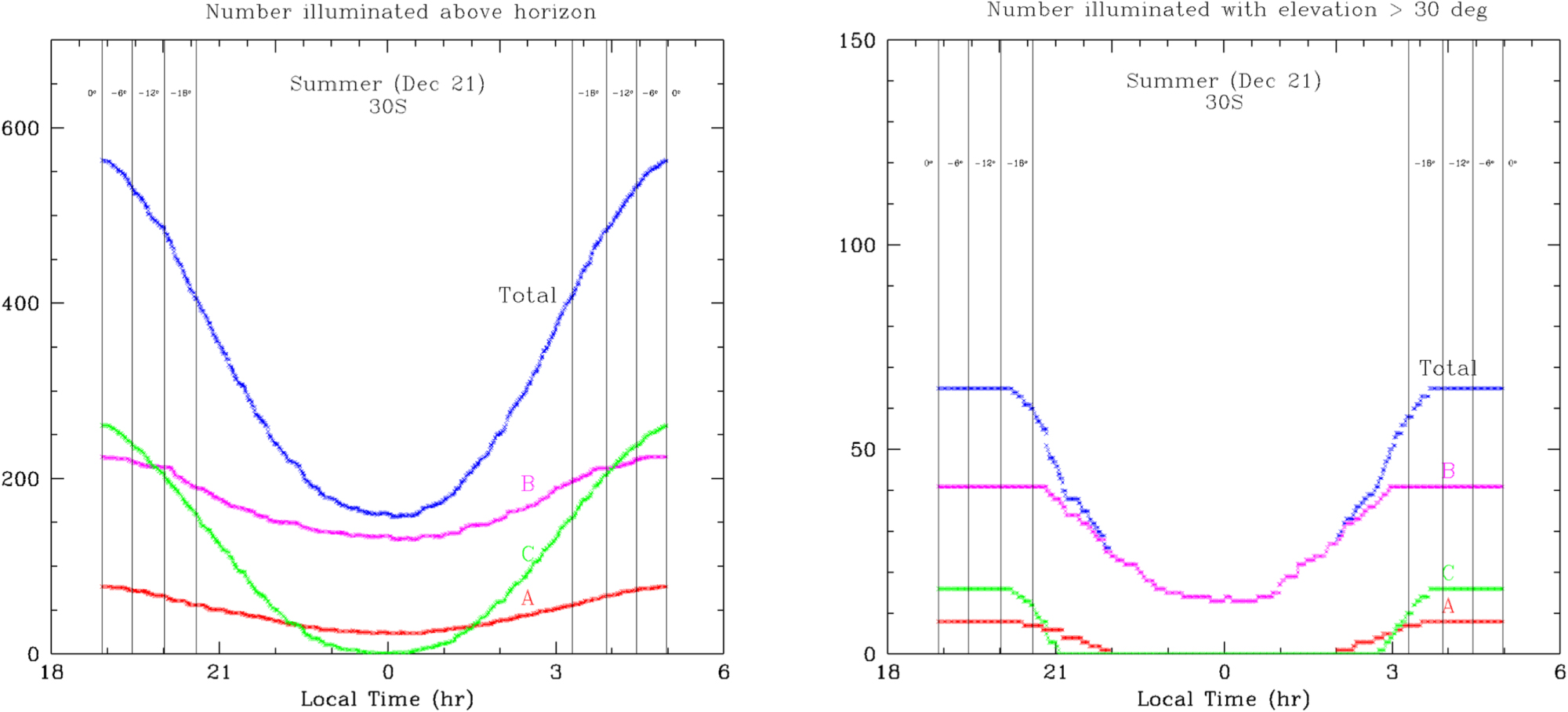 Starlink satellites visible from Cerro Tololo (30S) in summer vs. time of night. Number above the horizon (left); number above 30° elevation (right). At this latitude, the naked-eye layers A and C are in shadow except at twilight. At midnight 20 satellites are illuminated at high elevation corresponding to 2 × 10−3 per square degree.