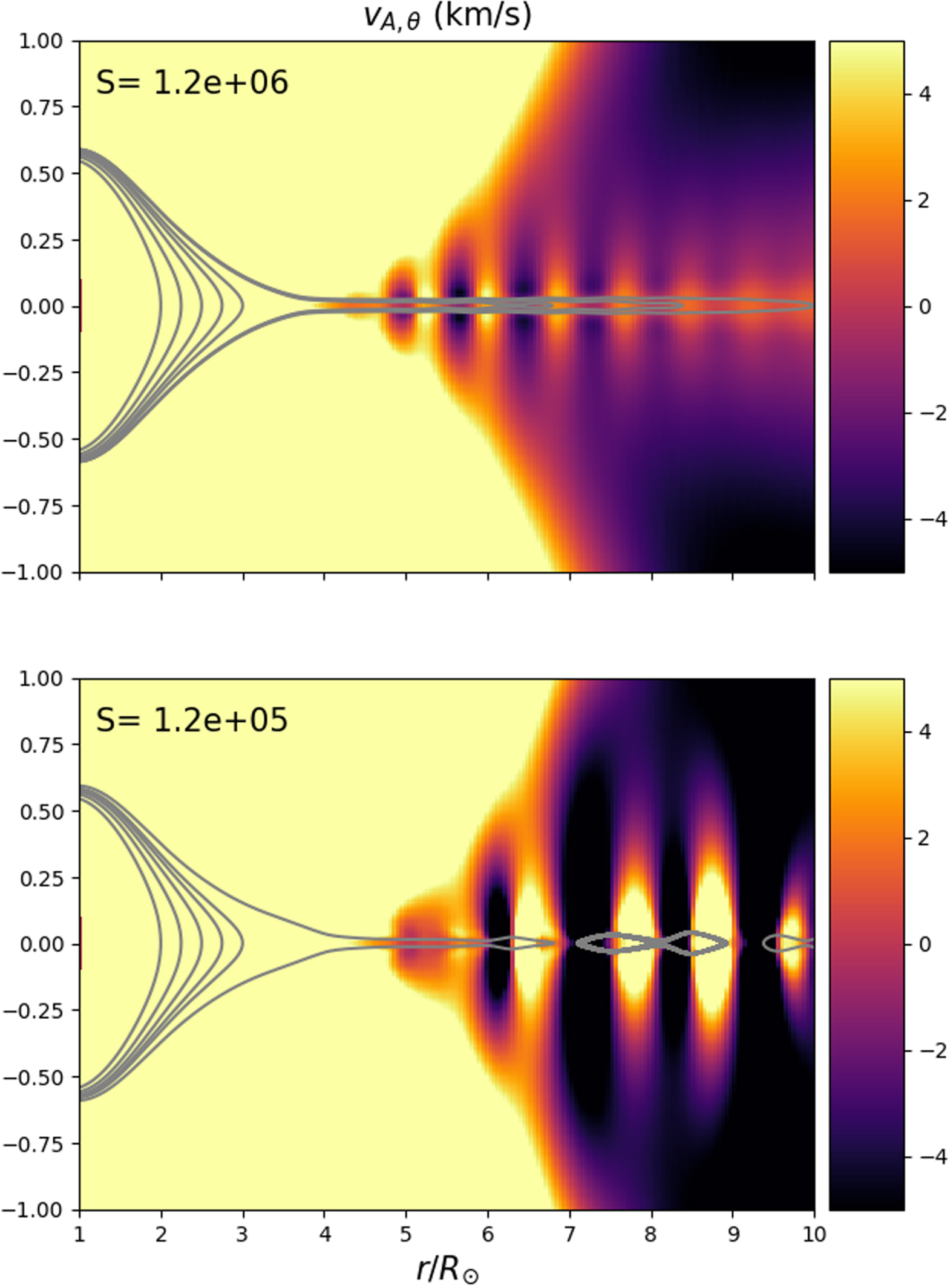 Snapshot of the fastest growing mode of a tearing instability in the current sheet. The background color is the latitudinal Alfvén speed vA,θ. The Lundquist number S is equal to 1.2 × 106, 1.2 × 105 in the top and the bottom panel, respectively. The aspect ratio is not respected to ease the visualization of the structures at the HCS.