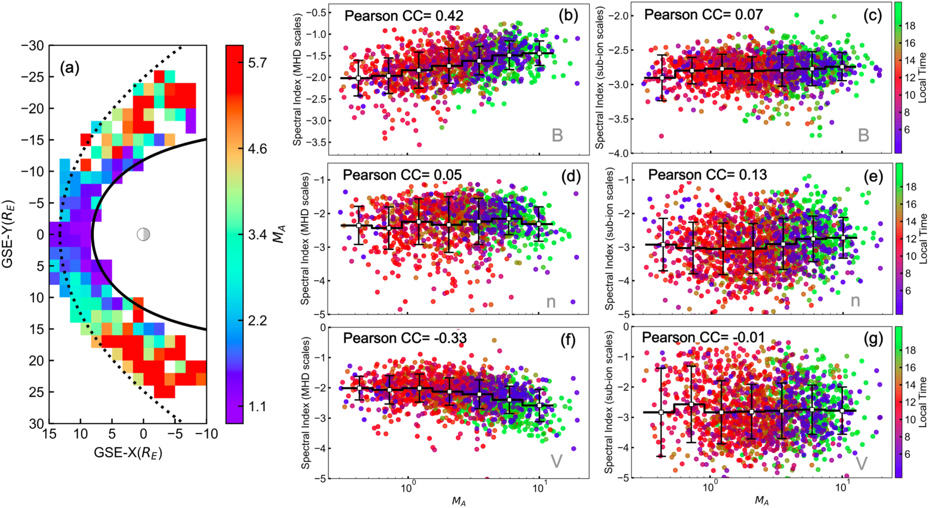 Evolution of magnetosheath turbulence from the subsolar region to the flanks. Panel (a) gives the 2D distribution of the Alfvén Mach number, ﹩{M}_{{\rm{A}}}﹩, in the GSE-XY plane of the magnetosheath. The black solid and the black dotted curves represent the nominal position of the Earth’s magnetopause and the bow shock estimated from the models proposed by Shue et al. (1997) and Chao et al. (2002), respectively. Panels (b), (d), and (f) present the magnetic-field spectral indices, the density spectral indices, and the velocity spectral indices at MHD scales as a function of ﹩{M}_{{\rm{A}}}﹩. The results for sub-ion scales are accordingly given in panels (c), (e), and (g). The color of the data points indicates the local time. The black horizontal line represents the mean value for each bin, and the vertical line represents the standard deviation. CC represents the correlation coefficient between the spectral slope and ﹩{\mathrm{log}}_{10}{M}_{{\rm{A}}}﹩.