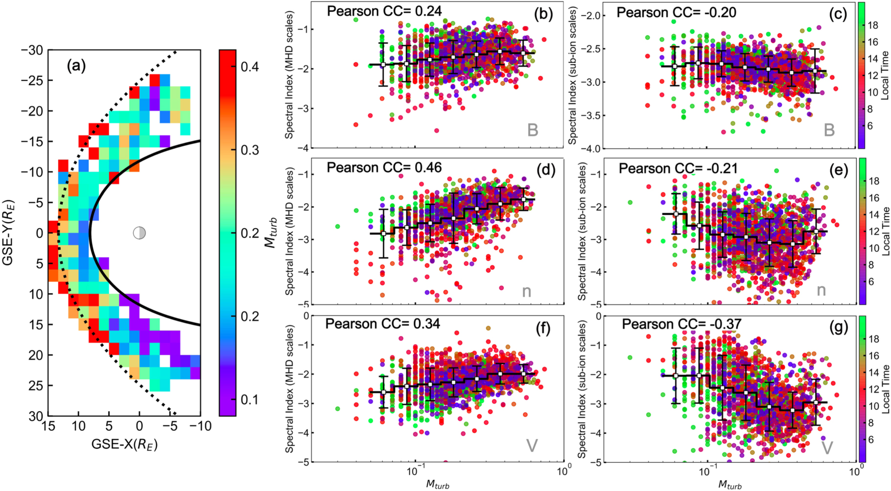 Evolution of magnetosheath turbulence from the bow shock to the magnetopause. Panel (a) gives the 2D distribution of the turbulent sonic Mach number, ﹩{M}_{\mathrm{turb}}﹩, in the GSE-XY plane of the magnetosheath. The black solid and the black dotted curves represent the nominal position of the Earth’s magnetopause and the bow shock estimated from the models proposed by Shue et al. (1997) and Chao et al. (2002), respectively. Panels (b), (d), and (f) present the magnetic-field spectral indices, the density spectral indices, and the velocity spectral indices at MHD scales as a function of ﹩{M}_{\mathrm{turb}}﹩. The results for sub-ion scales are accordingly given in panels (c), (e), and (g). The color of the data points indicates the local time. The black horizontal line represents the mean value for each bin, and the vertical line represents the standard deviation. CC represents the correlation coefficient between the spectral slope and ﹩{\mathrm{log}}_{10}{M}_{\mathrm{turb}}﹩.